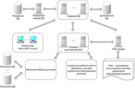 В сеть, кроме рабочих станций пользователей, входят также аппаратные и программные средства поддержки различных информационных сервисов масштаба предприятия. Основой построения таких сервисов является централизованная корпоративная база данных. Централизация позволяет снизить издержки по поддержанию работы корпоративной системы, повысить общую надежность и гибкость работы. Для выполнения сложных задач обработки данных используются специализированные сервера приложений КИС. Для работы с КИС удаленных пользователей используется Web-сервер. Для работы с локальными базами, которые по каким-либо причинам не переведены на централизованное хранение, используется механизм обмена данными.