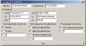В данном курсовом проекте пароль закрытого ключа «Taraninkey » – 123369, а пароль хранилища ключей «Taraninstore » – 123.