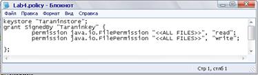 В данной курсовом проекте для получения доступа к локальной файловой системе, для подписанного электронной цифровой подписью апплета, был создан пользовательский файл политики безопасностиLab 4.policy.