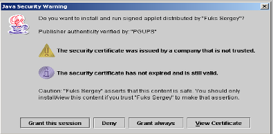 Подписанный электронной цифровой подписью апплет выполняется в среде MS IE с модулем plug-in из JDK 1.4.x.
