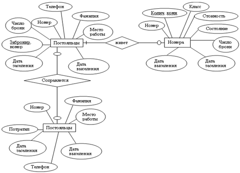 – Архив. Атрибуты сущности Архив: Фамилия, Место работы, Контактный телефон, Занимаемый номер, Потратил денег, Дата заселения, Дата выселения.