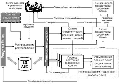 Работа системы анализа (рис. 2) начинается с получения из БД автоматизированной банковской системы сведений о ресурсах банка и заключенных финансовых сделках. На основании этих данных производится расчет показателей текущего состояния банка.