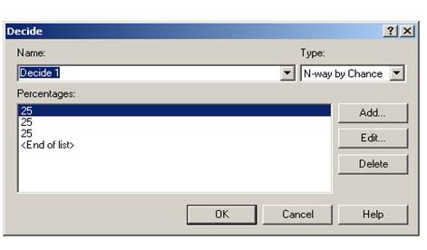 Далее транзакты следуют в модуль Decide под названием «decide».В этом блоке происходит определение, время или процент в ресурсе для транзакта.