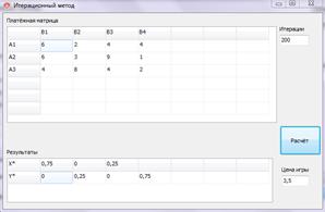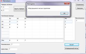 В результате проделанной работы было разработано программное средство для решения матричных задач методом чистых стратегий и итерационным методом.