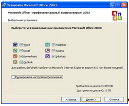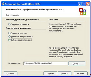 Выборочная- позволяет самостоятельно выбрать требуемые компоненты программы. Например, если вам совершенно не нужен Microsoft Exel, можете отменить его установку, используя этот пункт установки и нажав кнопку Далее .
