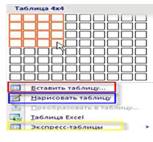 Переходим на страницуленты ВСТАВКА. Нажимаем на кнопкуТАБЛИЦАи в открывшемся окне раскрываем подменюЭКСПРЕСС-ТАБЛИЦЫ.