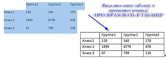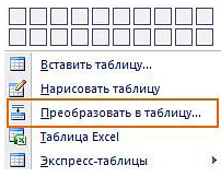Можно преобразовать в таблицу уже имеющийся у нас текст с разделителями. Знак табуляции (Tab) или запятая может отмечать места разбивки текста на столбцы.