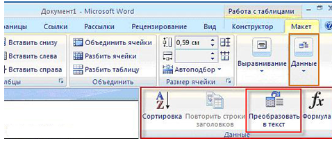 Возможно и обратное преобразованиетаблицыв текст, т.е. убратьтаблицуи оставить только текст. Для этого, выделяем нужныестрокитаблицы, переходим на закладкуленты МАКЕТи нажимаем кнопкуДАННЫЕ(рисунок 2.5)