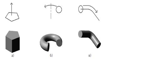 Рис 9.2 Образование объемных элементов: а)призмы, б)тора, в)кинематического элемента