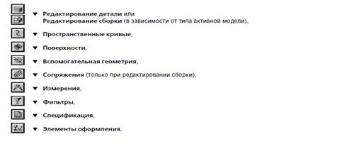 Когда в результате перебора подсветиться нужный объект, нужно щелкнуть мышью в окне документа или воспользоваться командой Выбрать подсвеченный объект из контекстного меню. Для выделение объектов определенного типа – вершин, ребер, граней, плоскостей или осей- служит инструментальная панель Фильтры.