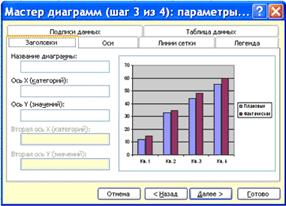 Третье окно диалога Мастера диаграмм содержит шесть вкладок. Они позволяют задать характеристики осей, название диаграммы и заголовки для ее осей, легенду, подписи значений в рядах данных и т.д. Все это можно выполнить при создании диаграммы или после ее построения.