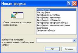В появившемся диалоговом окне «Новая форма» Выбрать способ создания формы и источник данных