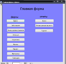 При открытии базы данных «Медицинский диагностический центр» открывается форма «Главная форма». Открытие этой формы одновременно с БД осуществляется путем помещения имени формы в строку «Форма» меню Сервис/Параметры запуска. Данная форма является панелью управления приложением. Ее кнопки обеспечивают вызов других кнопочных форм, а также отдельных объектов (отчетов, форм и т.д.). Данная форма была создана с помощью имеющегося в Access средства автоматизированной разработки форм по управлению приложением, называемого диспетчером кнопочных форм. Форма представлена ниже.