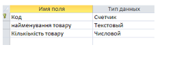 - Товари – код товару (ключове поле), найменування товару, кількість товару.