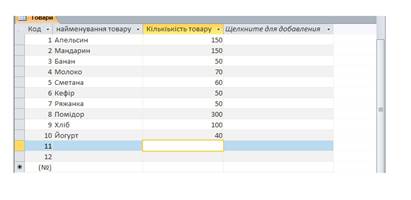 7. Відкриваю таблицю «Товари» та заповнюю в ній 10 рядків за своїм бажанням.