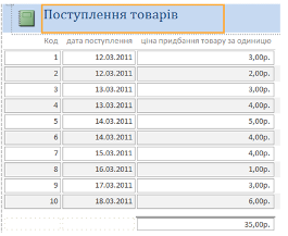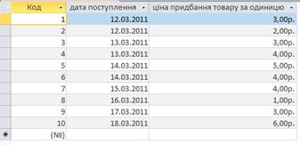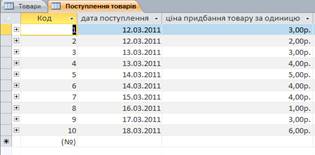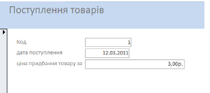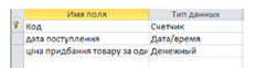- Поступлення товарів – код товару, дата поступлення, ціна придбання товару за одиницю.