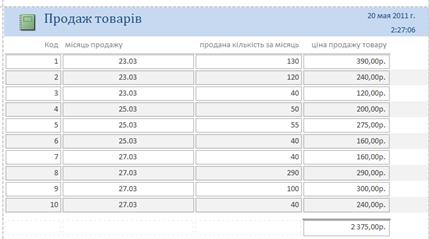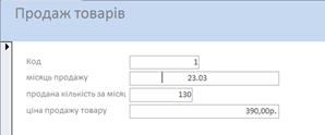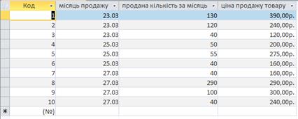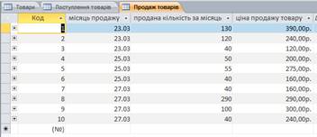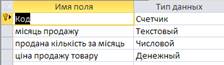 - Продаж товарів – код товару, місяць продажу, продана кількість за місяць, ціна продажу товару.