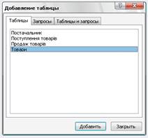3. Якщо раніше ніяких зв’язків між таблицями бази не було, то при відкритті вікна Схема даних одночасно відкривається вікно Додавання таблиці , в якому вибираю таблиці «Товари », «Поступлення товарів », «Продаж товарів », «Постачальник».