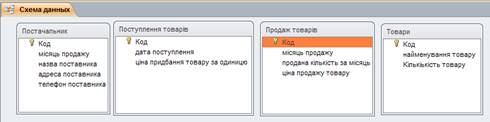В наведеному прикладі використовуються зв’язки «один-до-багатьох ». На схемі даних вони зображені у вигляді ліній з спеціальними значками біля таблиць.