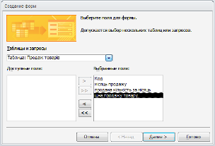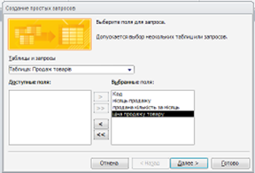 2. У діалоговому вікні, що відкрилося, вказую таблицю «Продаж товарів » і вибираю поля.