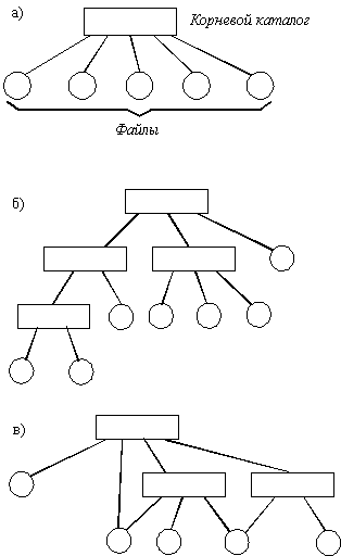 а - одноуровневая; б - иерархическая (дерево); в - иерархическая (сеть)