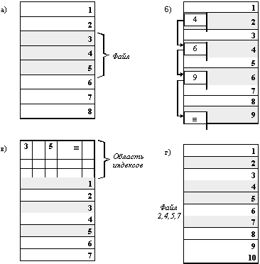 Записи могут быть расположены в файле последовательно (последовательная организация) или в более сложном порядке, с использованием так называемых индексных таблиц, позволяющих обеспечить быстрый доступ к отдельной логической записи (индексно-последовательная