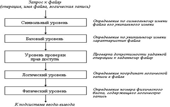 Задачей символьного уровня является определение по символьному имени файла его уникального имени. В файловых системах, в которых каждый файл может иметь только одно символьное имя (например, MS-DOS), этот уровень отсутствует, так как символьное имя, присвоенное файлу пользователем, является одновременно уникальным и может быть использовано операционной системой.