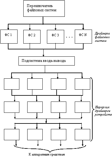 Для выполнения своих функций драйверы файловых систем обращаются к подсистеме ввода-вывода, образующей следующий слой файловой системы новой архитектуры. Подсистема ввода вывода - это составная часть файловой системы, которая отвечает за загрузку, инициализацию и управление всеми модулями низших уровней файловой системы. Обычно эти модули представляют собой драйверы портов, которые непосредственно занимаются работой с аппаратными средствами. Кроме этого подсистема ввода-вывода обеспечивает некоторый сервис драйверам файловой системы, что позволяет им осуществлять запросы к конкретным устройствам. Подсистема ввода-вывода должна постоянно присутствовать в памяти и организовывать совместную работу иерархии драйверов устройств. В эту иерархию могут входить драйверы устройств определенного типа (драйверы жестких дисков или накопителей на лентах), драйверы, поддерживаемые поставщиками (такие драйверы перехватывают запросы к блочным устройствам и могут частично изменить поведение существующего драйвера этого устройства, например, зашифровать данные), драйверы портов, которые управляют конкретными адаптерами.