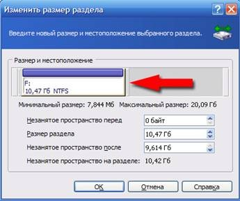 Программа сразу же выдаст информацию и минимальном и максимальном значениях для размера нового раздела, что не даст нам попасть пальцем в небо.