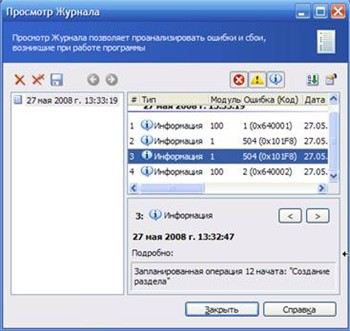 В программе ведется журнал событий, всегда можно просмотреть, что происходило с жестким диском, какие действия предпринимались самой программой. Это будет полезно, если мы забыли, как правильно совершить то или иное действие над жестким диском или выяснить последовательность шагов выполнения операции. У программы все ходы записаны (рисунок 10)!