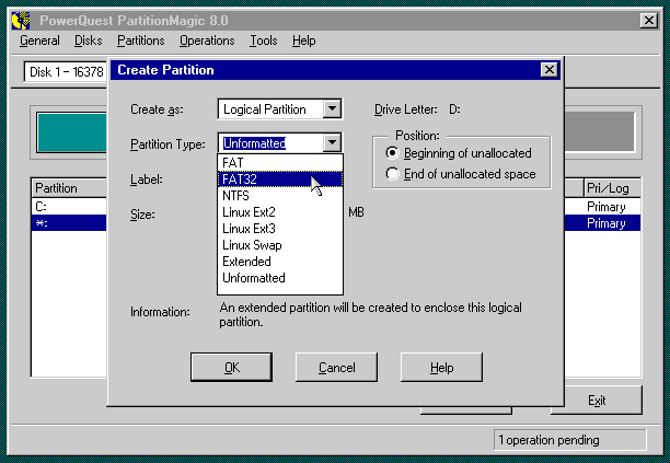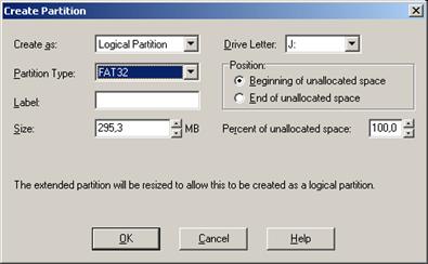 Коль скоро мы задались целью создать именно логический диск, то в поле Create as выберем параметр Logical, и файловую систему FAT32, которую понимают все системы от Microsoft.