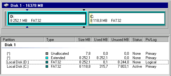 Нужды в дополнительном форматировании создаваемого раздела нет, поскольку мы задали тип файловой системы, но при желании отформатировать логический диск, например, в NTFS, к нашим услугам команда Format контекстного меню, или та же команда в меню Partition главного окна. По окончании вышеописанных процедур, новый раздел вместе с новеньким логическим диском D: явит нам свой чистый лик (рисунок 15):