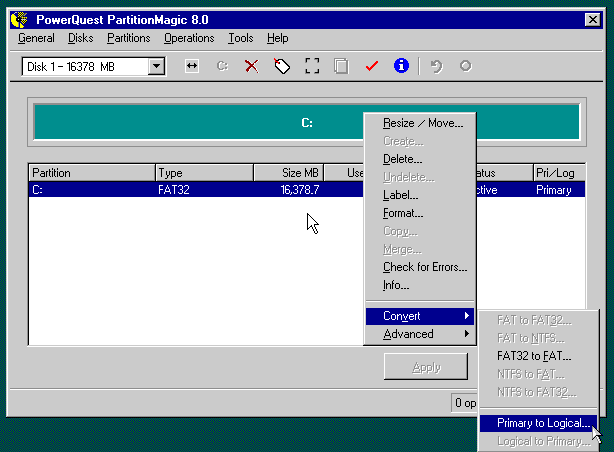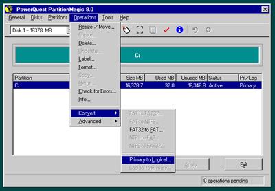 А вот что можно сделать с FAT32-разделом (рисунок 26): как видим, доступно превращение основного раздела в логический диск (Primary to Logical) и конвертация файловой системы в…FAT (имеется в виду система FAT16). Почему же недоступна команда для конвертации в NTFS? Открою маленький секрет: в этом разделе не было никаких данных, а, следовательно, нечего было терять, и для превращения файловой системы раздела в NTFS следует выбрать команду Format - только и всего.
