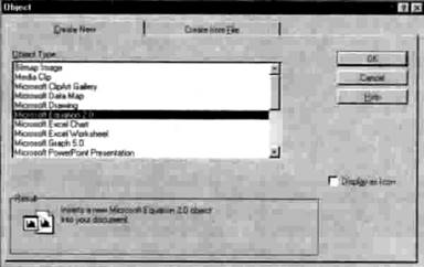 Для запуска Редактора формул из WinWord 7.0 необходимо установить курсор ввода в том месте документа, где должна быть вставлена формула. Затем следует вызвать команду Object… (Объект) из меню Insert, в разделе Create New (Создать новый) открывшегося диалогового окна, в списке Object Type (Тип объекта) выполнить щелчок на элементе Microsoft Equation 2.0 и нажать кнопку OK.