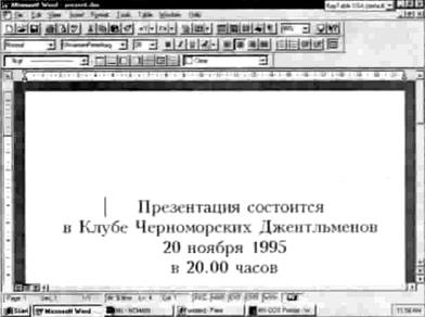 После выполнения всех установок следует щелкнуть в окне текста приглашения (рис. 35). Объект (оформленный текст в рамке) будет вставлен в документ. Если вместо созданного объекта на экране появиться надпись {EMBED WordArt\s\*mergeformat}, значит отображаются коды полей. Чтобы увидеть объект, необходимо нажать комбинацию клавиш [Shift+F9]. Размер рамки вокруг объекта можно изменить, переместив любой из восьми размерных манипуляторов в нужном направлении. Для изменения или оформления текста достаточно дважды щелкнуть на объекте. Определив тип объекта, WinWord 7.0 вызовет создавшую его программу - MS WordArt, после чего у Вас появится возможность обрабатывать объект.