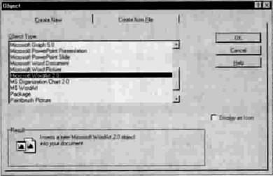 Вызовите команду Object… меню Insert и в разделе Create New диалогового окна Object, в поле списка Object Type выберите объект Microsoft WordArt 2.0. После нажатия кнопки ОК откроется окно программы MS WordArt.