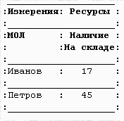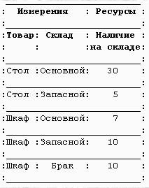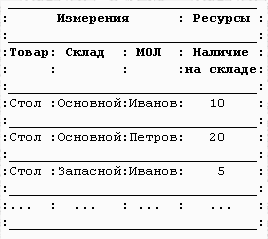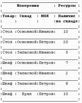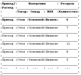 Приведем пример регистра остатков. Допустим, у нас есть Регистр "ОстаткиТоваров", измерениями этого регистра являются: "Товар", "Склад", "МОЛ". Регистр имеет один ресурс - "Количество". Содержание данного Регистра можно представить в виде следующей таблицы, где по каждому конкретному товару на конкретном складе за конкретным МОЛ числится определенное Количество товара.