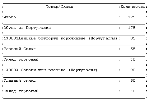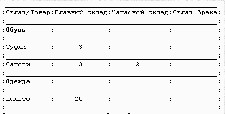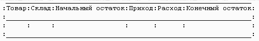 Предположим, я хочу получить "Данные об оборотах и остатках товаров на складах за какой-то период времени" в виде вот такой таблицы: