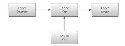 Отметим, что указанная схема взаимодействия является достаточно общей для описания любых процессов изменения информации в базе данных. Так, оно используется не только для манипулирования всеми данными пользователем, но и для таких процессов, как продажа продукции (источник - продавец, направление - покупатель, объект взаимодействия - продукция, процесс взаимодействия - класс Продажа, определяющий программные действия изменения данных) или изготовления детали (источник - сырье, направление - деталь, объект взаимодействия - станок, процесс взаимодействия - класс Изготовление, определяющий объект Рабочий, изготавливающий деталь и программные действия изменения данных).