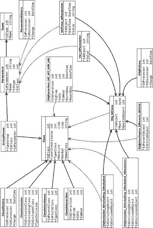Таблицы ClassHistory, ParameterHistory и ObjHistory_IdClass описывают динамические связи классов, объектов, параметров соответственно (предшественники - наследники), определяют время преобразования (классов, объектов, параметров) и представляют собой ациклические ориентированные графы.