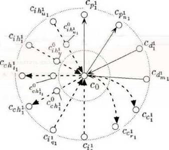 2. Схема слоев является ациклическим графом, который может не быть деревом. То есть может существовать в схеме слоев класс в одном из нижних слоев, который имеет несколько путей связей с базовым классом (например, это может возникнуть в результате множественного наследования через классы в более верхних слоях или в результате нескольких включений в другой класс в более верхнем слое схемы). При выполнении второго этапа (коррекции индекс-выборок) проблем не возникнет. Но при выполнении третьего этапа (построение «деревьев» данных объектов) порядок обхода «веток» получающегося цикла (циклов) может быть лучшим (меньший перебор), если сначала выбираются «ветки», имеющие меньшее число связей включения и наследования (ниже в одном из примеров этот случай будет рассмотрен).