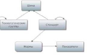 Наконец, класс Технологические группы продукции определяет группирование продукции по разным ее свойствам. Например, такими группами могут быть Диагональные шины, Радиальные шины, Автомобильные шины, Шины для грузовых машин и т. д. Некоторые группы могут пересекаться: например, в группу автомобильных шин могут входить и радиальные, и диагональные шины, а в группу диагональных шин могут входить и автомобильные шины, и шины для грузовых машин. Некоторые группы могут целиком входить в другие: например, группа Радиальные автомобильные шины входит целиком в группы Радиальные шины и Автомобильные шины. Для этого используется отношение внутреннего включения объектов, что указывается пунктирной стрелкой, идущей из этого класса в него же.