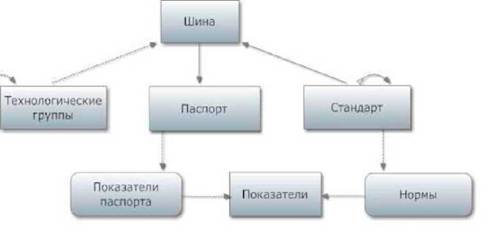 Требования к продукции описываются классом Стандарт, который является родительским классом для классов Шина, Протектор, Боковина, Ободная лента, Брекер, поскольку каждый объект этих классов наследует свойства родительского объекта-стандарта такие, как Наименование стандарта и все связи включения других классов в класс Стандарт. В данном случае класс Показатели, включенный в класс Стандарт, определяет для каждого объекта-стандарта те объекты-показатели, значения которых могут быть критичными для соответствия продукции стандарту. Поэтому включение класса Показатели в класс Стандарт идет через класс связи Нормы показателя (на схеме класс связи изображается прямоугольником со скругленными углами, который находится в разрыве пунктирной стрелки связи), объект которой для каждой пары объектов стандарт и показатель, определяемой отношением включения, может задавать диапазон ограничений значения показателя через Нижнюю норму и Верхнюю норму. Таким образом, каждый объект классов Шина, Протектор, Боковина, Ободная лента, Брекер наследует через свой объект-родитель в классе Стандарт, не только наименование этого стандарта, но также и показатели вместе с ограничениями на их значения, которым должна удовлетворять соответствующая продукция.