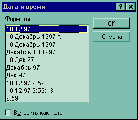Наконец, можно вставить в текст документа текущее время и дату - для этого выполните команду Дата и время ( Date And Time) из меню Вставка и найдите в появившемся списке подходящий формат (рис. 2). Если установить флажок Вставить как поле ( Insert As Field), то Word автоматически будет обновлять дату и время при каждой печати документа; в противном случае дата и время останутся такими, какими они были в момент вставки.