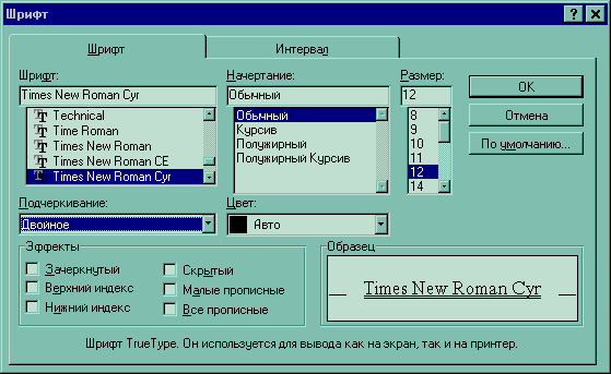 При открытии диалога Шрифт в нем показаны текущие атрибуты формата выделенного текста. Если значение какого-либо атрибута изменяется в выделенном тексте (например, некоторые символы - полужирные, а другие- нет), то поле, соответствующее этому атрибуту, остается незаполненным (или, если атрибут включается установкой флажка, маркер будет серого цвета).