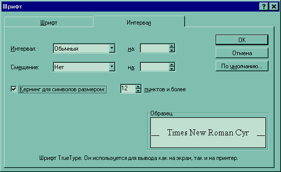 Если установить флажок Кернинг на вкладке Интервал (рис.5), Word будет сокращать интервалы между некоторыми парами символов, чтобы придать тексту более компактный (и профессиональный) вид. Word автоматически регулирует кернинг символов, размер которых равен или превышает значение, указанное в поле Пунктов и более ( Points And Above). Кроме того, выбранный шрифт должен относиться к семейству шрифтов TrueType (или PostScript, если вы используете Adobe Type Manager).