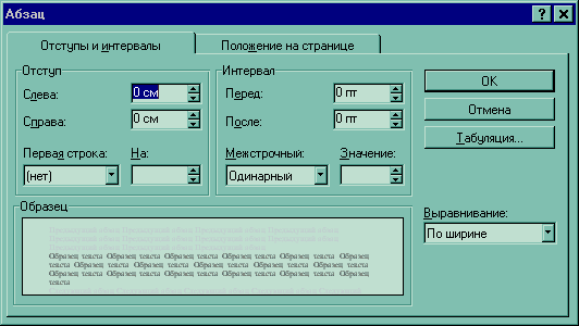 С помощью диалога Абзац можно установить любой из перечисленных в таблице 1 атрибутов. Оно открывается командой Абзац в меню Формат или же щелчком правой кнопки мыши в тексте и выполнением команды Абзац из контекстного меню. На рис.6 изображена вкладка Отступы и интервалы (Indents and Spacing) окна диалога Абзац, а на рис.7 - вкладка Положение на странице (Text Flow). Как и при работе с окном Шрифт, выбор атрибутов формата в окне диалога Абзац облегчается тем, что Word показывает образец текста, отформатированного с применением выбранных атрибутов.
