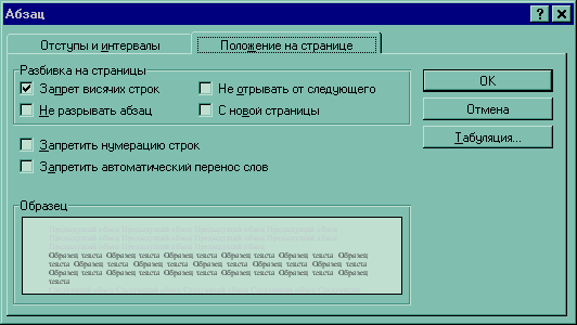 рис.7 Вкладка Положение на странице в окне диалога Абзац