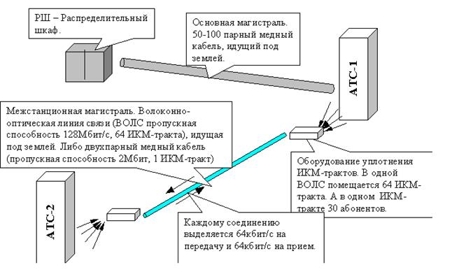 Как видно из рисунка многопарный медный кабель из-за дороговизны обслуживания и низкого качества соединения теперь используется эффективнее. Но на смену пришла ВОЛС (Волоконно-оптический линия связи), которая передает цифровой поток со скоростью до 300Мбит/с и более(скорость передачи цифрового потока по 4-парному медному проводу 2Мбит/с). То есть теперь абонентское соединение после коммутации на механической АТС аналоговый сигнал выходит со станции и входит в оборудование ЦСП. Аналого-цифровой преобразователь (АЦП) превращает этот сигнал в цифровой поток 64кбит/с на передачу и 64кбит/с поток в аналоговый сигнал на прием. Потом 30+2 цифровых потока (2 управляющих) по 64кбит/с объединяются в один 2Мбит-ный поток E1 (ИКМ-тракт). В ВОЛС входит до 64 потоков E1. С другой стороны магистрали ситуация повторяется с точностью до наоборот. С ВОЛС снимаются 64 цифровых потока E1, далее каждый разбирается на 64кбит-ные потоки, и подаются на цифро-аналоговый преобразователь (ЦАП). Получившийся аналоговый сигнал поступает на станцию, и после коммутации к абоненту.