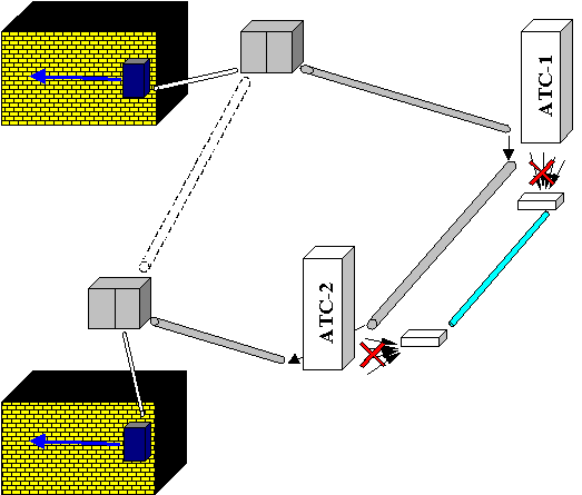 Как видно из рисунка, предоставление абонентам прямой линии требует выделение свободной пары во всех магистралях по пути ее установки. На станцию пара не заходит, а соединяется с парой из следующей магистрали в кроссе . И важным свойством прямой линии является то, что она не заходит ни в ИКМ-тракт или другое оборудование уплотнения, а, следовательно, рабочий диапазон частот не ограничен 3,3кГц и нет потерь из-за временных задержек и дрожания фазы. И последним важным фактором является полная длина прямой (чем больше длина, тем хуже параметры линии), и уже имея этот параметр, можно взяться за выбор модели модемов. В таких случаях рекомендуют либо модемы short-range модемы (модемы “последней мили”), либо широкополосные xDSL модемы с пропускной способностью 2Мбит/с и более.